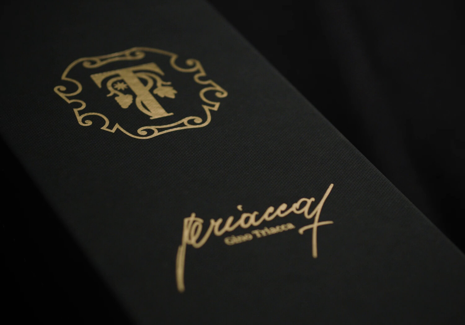 L’etichetta della bottiglia è un segno di classe, concepita per farsi riconoscere: la firma di Gino Triacca, dorata e nitida sul fondo scuro.